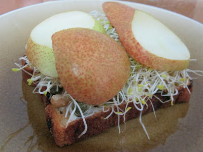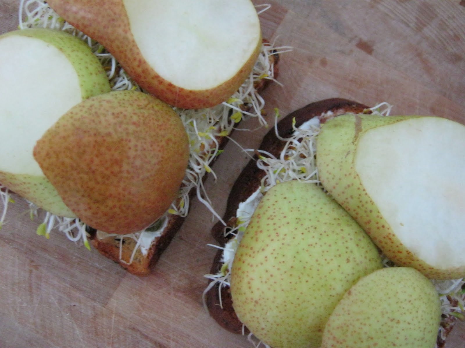 Directions: Toast the bread. Spread 1 tbsp cream cheese on each slice and sprinkle with capers and walnuts. Add sprouts and cover wit pear slices. If there are pear slices left, eat them! đŸ˜‰