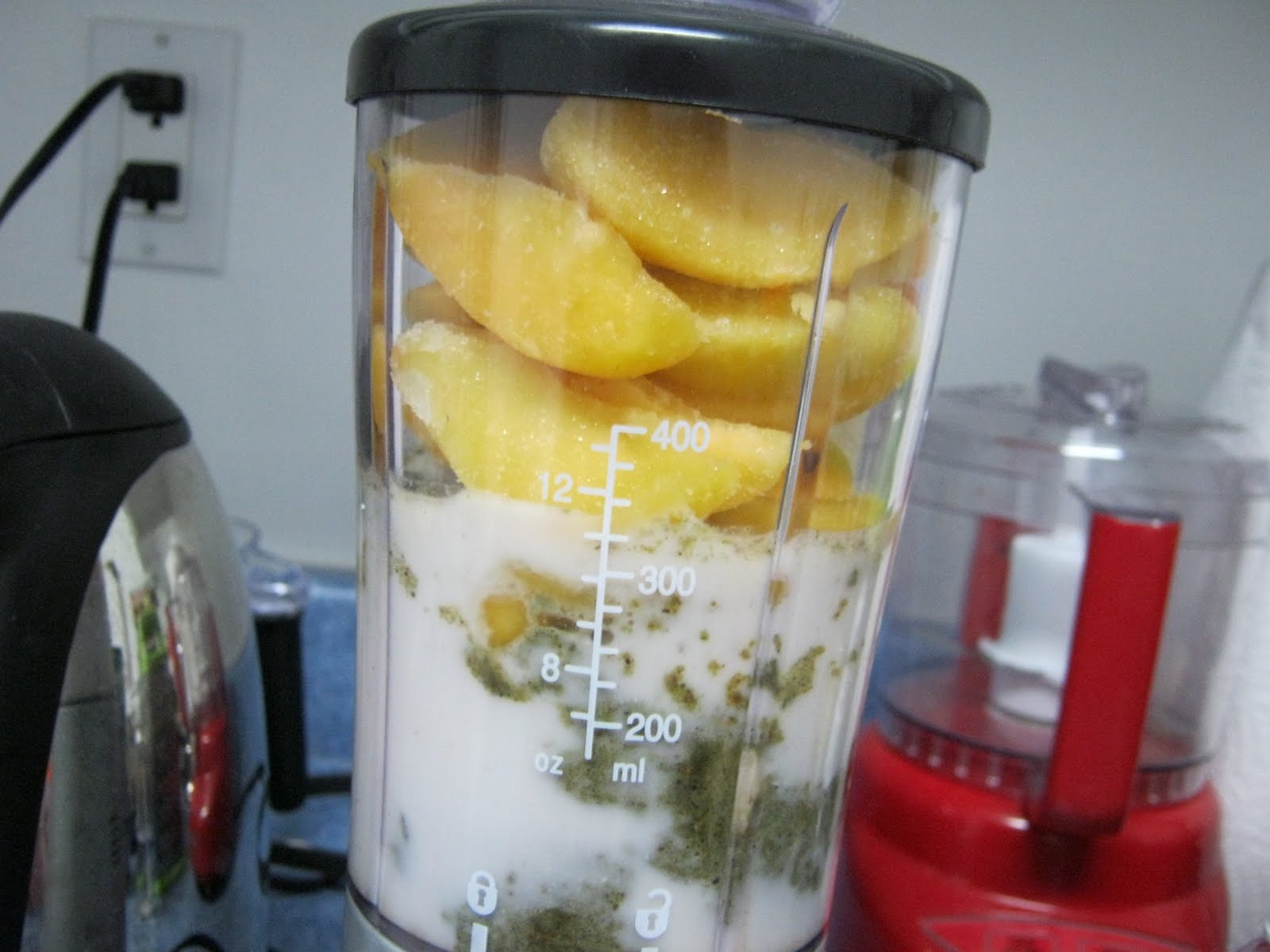 Almond milk, 1 scoop Amazing meal, 1 banana, frozen peaches.