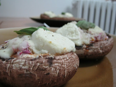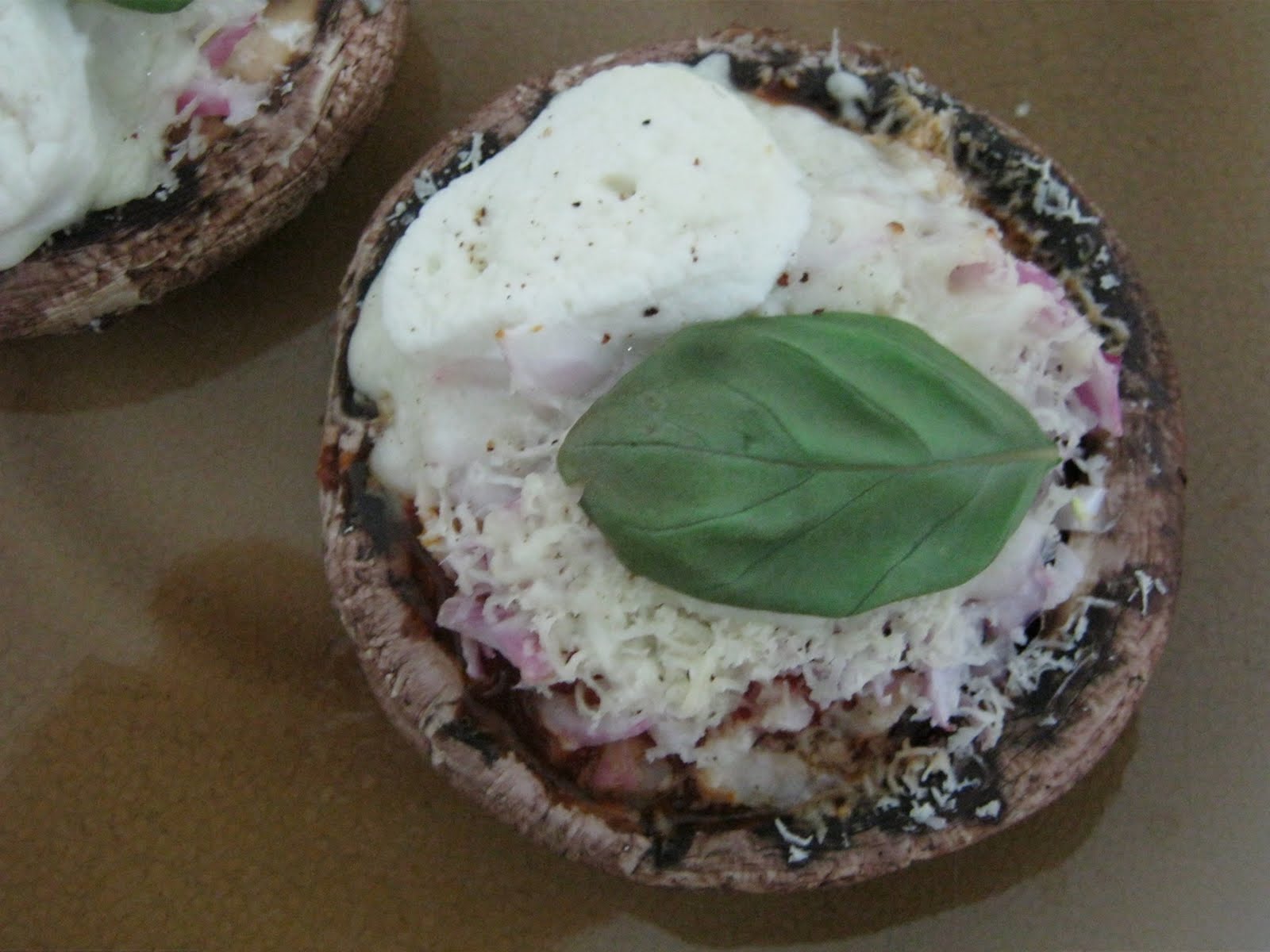 Directions: Preheat oven at 375°F and cover a baking sheet with parchment paper. Remove stems of Portabellas and gently clean them with a damp cloth. Place them stem-side up on the baking sheet. Fill the cavity with pizza sauce (2-3 tbsp). Sprinkle red onion, 1 tbsp Romano and 1 tbsp Mozzarella on each Portabella. Put one goat cheese slice on top of each, sprinkle with pepper and bake for about 15 minutes, until cheese is melted and the goat cheese starts to brown. Add the basil leaf and bake for one more minute.
