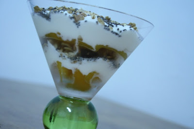 Peaches, plain Greek yogurt, granola and chia seeds. Delicious!