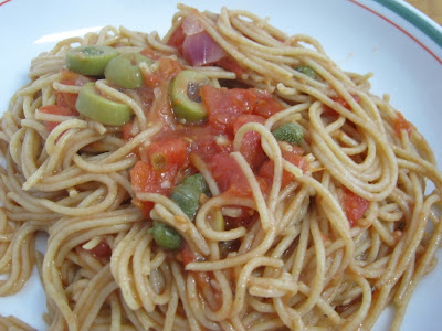 I was at Diran’s last night and we studied all afternoon (at the library, then at Starbucks). He had a staff dinner tonight so I went home and ate some leftover Puttanesca Pasta. I made it yesterday and since I didn’t get to give you the recipe… here it is!