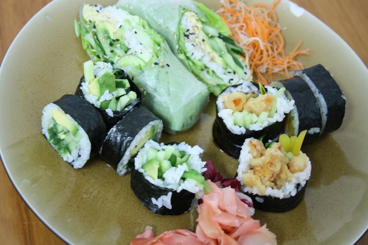 Left: Vegetarian roll (cucumber, daikon, seaweed salad and avocado).