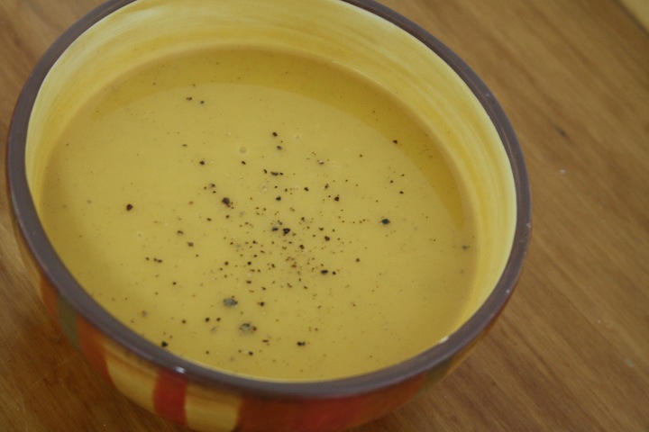 Add salt, pepper and coconut cream: when opening the coconut milk, scoop out the cream on top and leave the water. Using an immersion blender, puree the soup. If using a regular blender, let soup cool for about 20 minutes before blending.