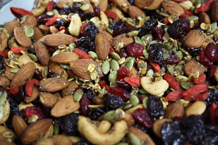 Mine was made with: 1 1/2 cups almonds, 1/2 cup cashews, 1/2 cup pepitas, 1 tbsp chia seeds, 1/2 cup dried cranberries, 1/4 cup goji berries and 1 1/4 cups dried cherries.