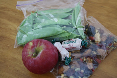 Snow peas, apple, Pumpkin Spice Trail Mix and two molasses kiss.