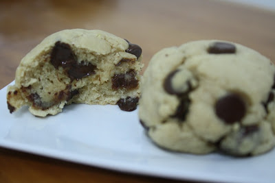 Directions: In a bowl, whisk flour, salt, baking powder & baking soda. In a second bowl, mix sugars and earth balance with a hand mixer until creamy. Add applesauce and vanilla and mix with a spoon. Add dry to wet ingredients and mix with a spoon, or with your hands if necessary, until just combined. Fold in chocolate chips (I used my hands for that too).