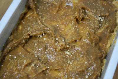 Grease a 5″ x 9″ bread pan. Pour half the batter and spread out with the back of a spoon or a spatula. Scoop half the pumpkin butter in the middle of the pan. Spread & swirl with a spoon. Pour the rest of the batter on top of the pumpkin butter and spread. Spoon the rest of the pumpkin butter on top and swirl. Sprinkle the turbinado sugar on top.