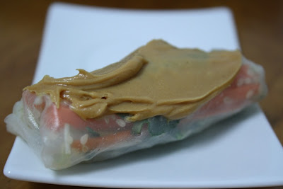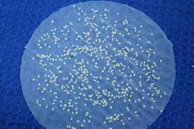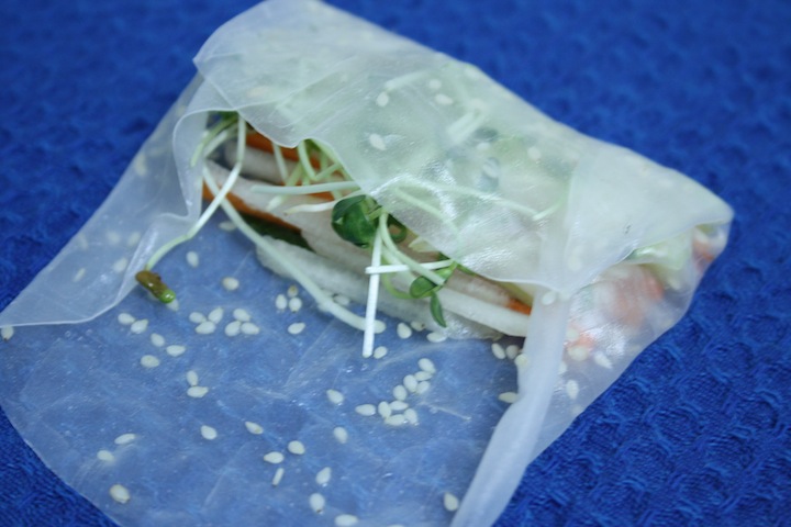 Directions: Place a damp clean kitchen towel on your table or counter and fill a bowl with warm water. Dip a rice paper in the water for 5 seconds and place on the towel. Sprinkle with sesame seeds, place a mint leaf, as well as carrot, cucumber and pear matchsticks (I used approximately 10 carrot, 6 cucumber & 10 pear matchsticks for each roll) Add sprouts and roll (see pictures above). Repeat until you are out of ingredients. Serve with your favorite dip.