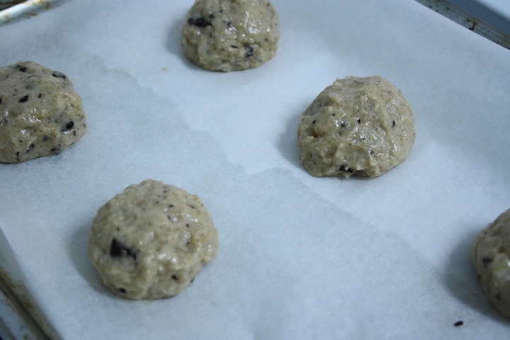 Line a baking sheet with parchment paper. Wet your hand and make 1 tbsp balls of dough. Place them on the baking sheet (no need to flatten the top).