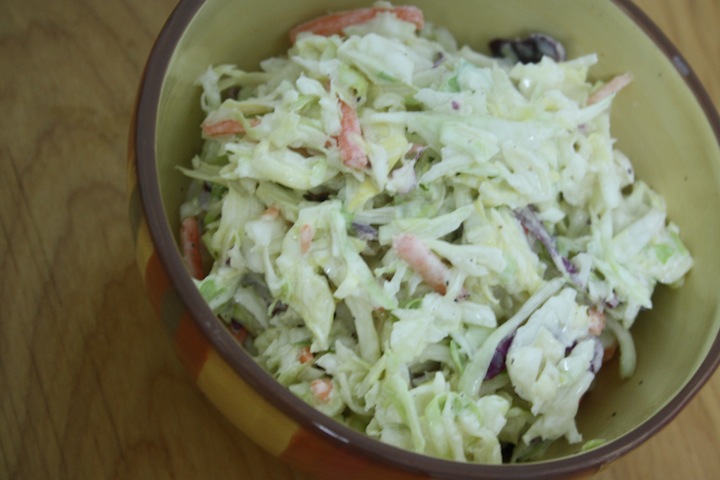 Serve with salad and rice; I had leftover coleslaw and brown basmati rice.