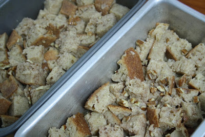 Coat 2 bread pans with cooking spray or a little oil. Pour in the bread pudding and sprinkle with more cinnamon if desired. Cover with foil and let sit in the refrigerator overnight.